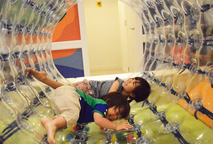 バブルヒルは、転んでも痛くない柔らか素材のドーム型すべり台。サイドから噴射される散水の中で、飛んだり滑ったり、小さなお子様から楽しめるプールです。