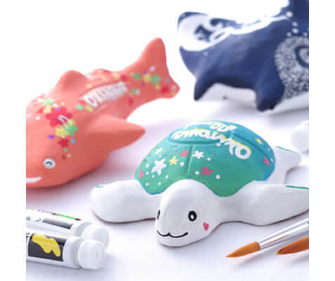 美ら海絵付け...ジンベエザメ、マンタ、アリビーの形をした陶器にアクリル絵の具で色つけを行うクラフト。世界でひとつだけのオリジナルクラフトをお楽しみください。