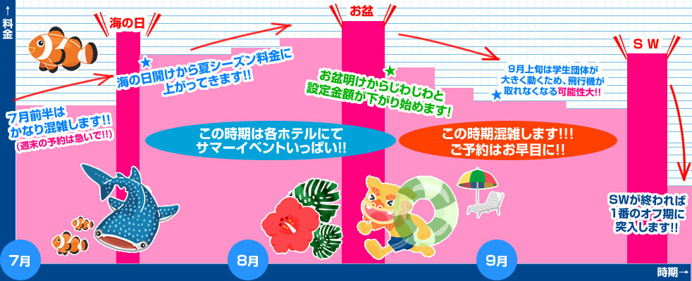 しかし、沖縄といってもやっぱりそれぞれのシーズンがあります。春夏秋冬...季節に応じた沖縄の過ごし方はもちろんあるんです。あなたは何を目的として沖縄に行きますか—。マリン?観光??それともイベント?価格が安い時期が本来沖縄に行ってやりたい事が出来ない時期だったとしたら行く意味がなくなっちゃいますよね。